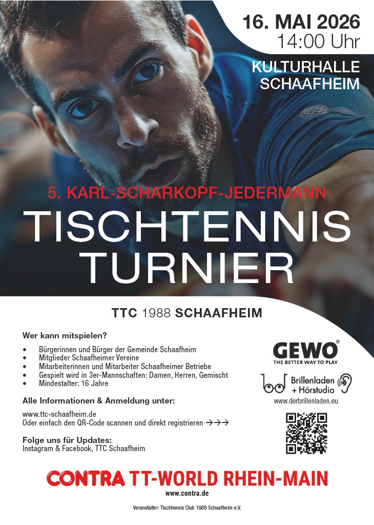 Am vergangenen Samstag veranstaltete der Tischtennis Club 1988 Schaafheim das 3. Karl Scharkopf Jedermann Turnier in der Kulturhalle. Im Rahmen der Aktionswoche vom 18. – 25. Mai 2024 des Hessischen Tischtennis Verbandes konnte sich somit auch der TTC Schaafheim präsentieren und auch zeigen wie großartig dieser Sport ist.